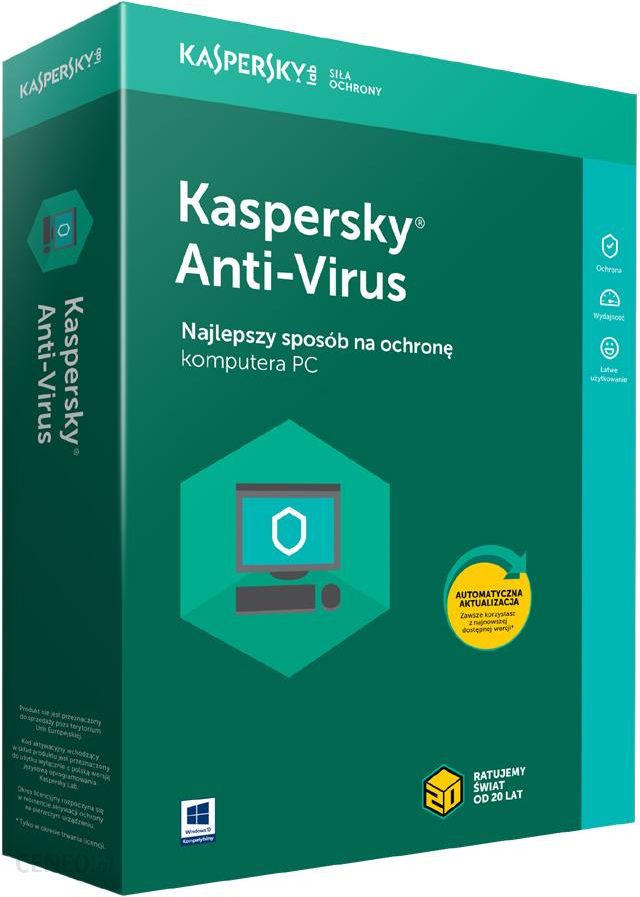 Podstawa ochrony komputera PCOprogramowanie Kaspersky Anti-Virus zapewnia niezbędną ochronę przed wszelkimi szkodliwymi programami. Jako podstawowy element zabezpieczeń komputera, rozwiązanie to chroni przed najnowszymi wirusami, programami szpiegującymi, robakami i innym szkodliwym oprogramowaniem. To łatwe w użyciu rozwiązanie zabezpieczające, które nie spowolni Twojej pracy.Ochrona przed wirusami, robakami, trojanami i innym szkodliwym oprogramowaniemSkuteczna ochrona, która nie spowolni Twojego komputeraŁatwe zarządzanie ochroną i dostęp do pomocy technicznejBEZPIECZEŃSTWO – ochrona przed wirusami, robakami, trojanami i innym szkodliwym oprogramowaniem.Cyberprzestępcy każdego dnia tworzą setki tysięcy nowych szkodliwych programów. Z tego powodu nasze wspomagane przez chmurę rozwiązanie jest nieustannie doskonalone, dzięki czemu ochrona przed wszelkimi szkodliwymi programami jest jeszcze skuteczniejsza.WYDAJNOŚĆ – bezpieczeństwo na najwyższym poziomie* bez wpływu na wydajność komputera.Nasze technologie zabezpieczeń łączą w sobie maksymalną ochronę i wydajność – działają w tle bez spowalniania Twojej pracy. Dodatkowo, specjalny Tryb gracza zapewnia rozrywkę bez irytujących przerw.ŁATWE UŻYTKOWANIE – bezproblemowe zarządzanie bezpieczeństwem i dostęp do pomocy.Bezpłatne konto My Kaspersky umożliwia zarządzanie zabezpieczeniami z dowolnego miejsca z dostępem do internetu. Możesz sprawdzać stan licencji i zabezpieczeń komputera, dostosowywać najważniejsze funkcje zabezpieczeń, otrzymywać oferty specjalne, a także pobierać bezpłatne produkty Kaspersky Lab. Konto My Kaspersky daje również dostęp do pomocy technicznej.* Najlepszy wynik w testach z 2014 roku. Szczegółowe informacje są dostępne na stronie www.kaspersky.pl/nowosci/nagrody.Architektura (32/64-bit) – tylko procesory i systemy op. – reszta wywalić!: Brak danych Czas trwania (licencji / subskrypcji): 1 rok Informacje dodatkowe: Po zakupie produktu na adres mailowy, podany przez Państwa podczas zamówienia, zostaną przesłane wiadomość powitalna z serwisu dlocker.eu oraz wiadomość z informacją że został zamówiony kolejny klucz ESD (kod rejestracyjny).Kod rejestracyjny należy przekazać klientowi końcowemu (użytkownikowi oprogramowania), który będzie mógł go wymienić za pośrednictwem strony https://rejestracja.kaspersky.pl na kod aktywacyjny służący do aktywowania oprogramowania. Po dokonaniu wymiany, użytkownik otrzyma kod aktywacyjny, który zostanie przesłany na adres e-mail podany w formularzu znajdującym się na powyższej stronie internetowej. Wymiana kodu rejestracyjnego na kod aktywacyjny może być przeprowadzona wyłącznie przez użytkownika oprogramowania. Oprogramowanie Kaspersky Lab można pobrać z działu Do pobrania na stronie internetowej firmy Kaspersky Lab Polska:http://www.kaspersky.pl/pobierz_produkty W celu rozwiązania jakichkolwiek problemów związanych z oprogramowaniem Kaspersky Lab prosimy o skorzystanie z bazy wiedzy (http://pomoc.kaspersky.pl) lub kontakt z działem pomocy technicznej: e-mail: pomoc@kaspersky.pl tel.: 801 000 215, 34 390 94 00 Licencja: Dla małych firm Licencja: Do użytku domowego Liczba stanowisk / jednostek: 1 Nośnik (filmy, gry, oprogramowanie): Brak Rodzaj (oprogramowanie): Bezpieczeństwo Szczegóły licencji: KOD REJESTRACYJNY w postaci klucza ESD, który Klient Końcowy musi zarejestrować na stronie https://rejestracja.kaspersky.pl/, aby otrzymać klucz produktu. Wersja: Cyfrowa / do pobrania Wersja językowa (oprogramowanie): Polska Wymagania sprzętowe: