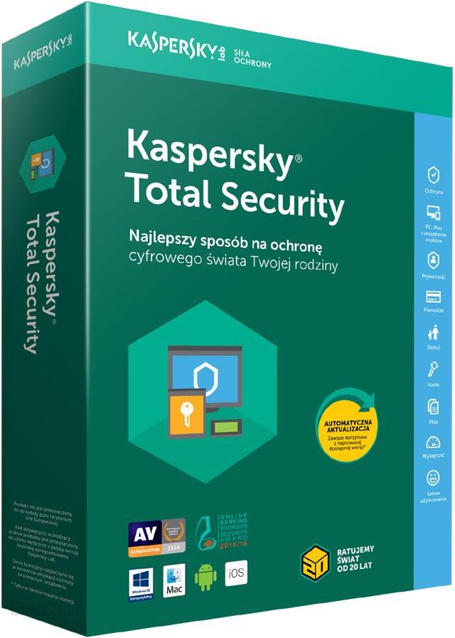 Kaspersky Total SecurityWielokrotnie nagradzane technologie bezpieczeństwa dbają o ochronę Twojej rodziny, łącznie z prywatnością, pieniędzmi i najcenniejszymi wspomnieniami. Nasze produkty chronią komputery PC oraz Mac, urządzenia z systemem Android, a także iPhoney i iPady.Ochrona Twojej rodziny – prywatności, wspomnień oraz danychDodatkowa warstwa ochrony dla zakupów i transakcji finansowych onlineOchrona dzieci – dzięki narzędziu Kaspersky Safe KidsZakres dostępnych funkcji jest zależny od rodzaju chronionego urządzenia.