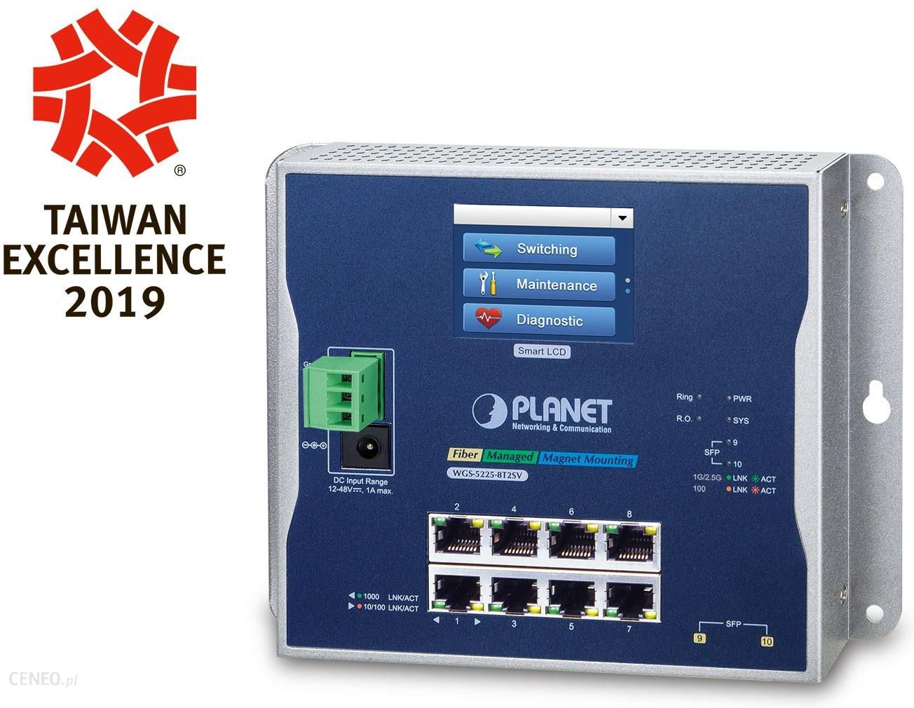 PLANET WGS-5225-8T2SV. Switch type: Managed, Switch layer: L2+. Basic switching RJ-45 Ethernet ports type: Gigabit Ethernet (10/100/1000), Basic switching RJ-45 Ethernet ports quantity: 8, Installed SFP modules quantity: 2. Full duplex. MAC address table: 8000 entries, Switching capacity: 20 Gbit/s. Networking standards: IEEE 802.1D,IEEE 802.1Q,IEEE 802.1ab,IEEE 802.1p,IEEE 802.1s,IEEE 802.1w,IEEE 802.1x,IEEE…. DC input voltage: 12 – 48 V. Power connector: Terminal block (3-pin). Wall mountable