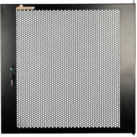 Perforowane drzwi do szafy RACK o wysokości 12U. Drzwi wykonane są z blachy stalowej o grubości 1,5 mm.